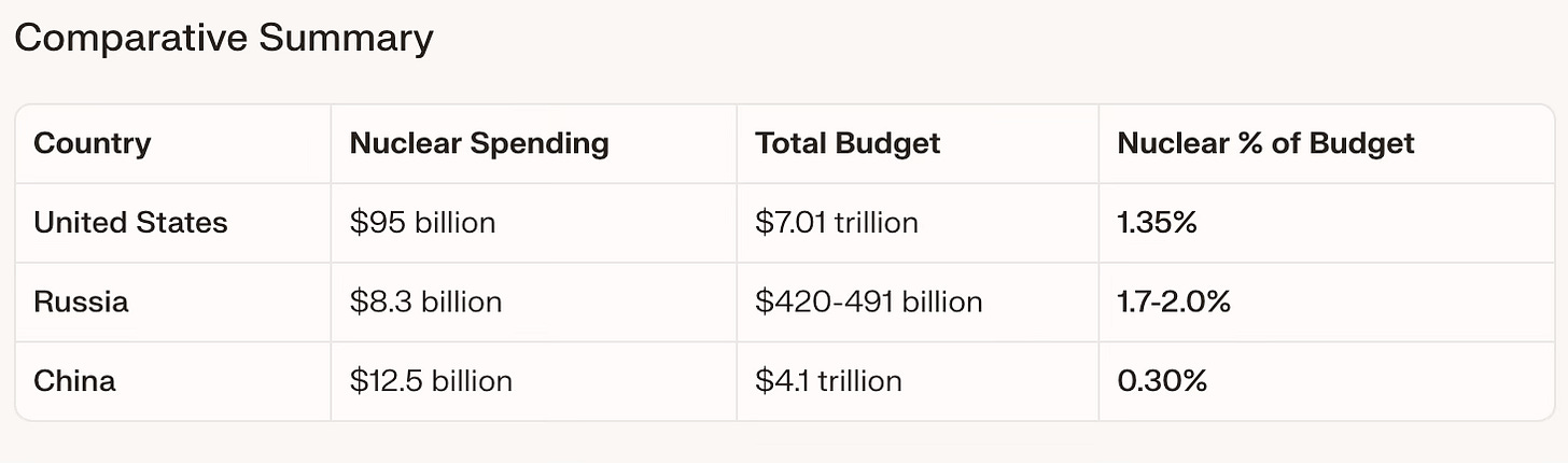 This compares with Russia’s and China’s estimated annual spending of $8.1 billion and $12.5 billion, respectively. The Russian defense budget is classified, with the nuclear component hidden across several budget categories, thus making an accurate estimate difficult. The same is true of Chinese nuclear spending, so these estimates are approximations based on educated guesses. However, it suffices to say that the US outspends all nuclear powers combined by a multiple of 2X.